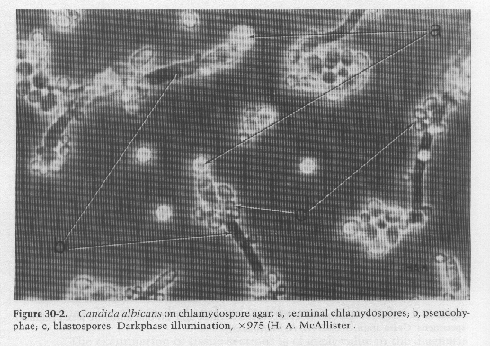 Histoplasma RingwormMice and rats are very rarely affected by Trichophyton mentagrophytes. If they are affected they develop alopecia and focal crusts on the head.{3763} Rabbits may be similarly affected by Trichophyton mentagrophytes, Microsporum canis or Microsporum gypseum.{3768} In neonatal guinea pigs, T. mentagrophytes is fatal in almost all animals. Culling is advisable as sows usually have recurrent infections at parturition.{3775} Young ruminants are often infected with T. mentagrophytes, particularly around the eyes and face.{4206} Aspergillus fumigatusLesions are occasionally found in rabbits at necropsy, and are nodules with a central area of necrosis surrounded by mononuclear cells and giant cells. Fungal hyphae can be demonstrated with silver stain or PAS.{3768} Blastomyces dermatitidisThe eastern and midwestern US are the most common places to acquire blastomycosis. This is a dimorphic fungus which affects the lungs, skin and bone. Lesions are granulomas and suppurative nodules with caseous necrosis. It affects humans and dogs mostly. Finding organisms in tissue sections supports the identification of the fungus. Yeasts are large (5-20m), thick-walled and spherical. The cell wall does not stain. Buds are attached to mother cells by a wide base. In the photograph, organisms in the skin of a dog are seen surrounded by a clear zone which is the non-staining (on PAS) cell wall.{3953} It is handled using ABSL2 techniques. Candida albicans