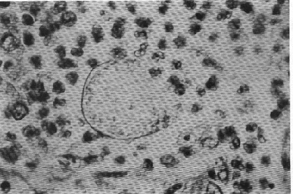 Candida is a ubiquitous organism causing opportunistic infections in immunocompromised or antibiotic-treated animals such as NHPs. Signs are dysphagia and a white pseudomembrane in the mouth. The lesion rarely penetrates past the basement membrane. H&E stain reveals organisms, but PAS or GMS stains are better{3770}. The photograph shows a dark-phase illumination of septate hyphae and oval budding blastospores from Carter{3953}. Coccidioides immitisUnlike histoplasmosis, coccidioidomycosis occurs in arid regions, for example in the southwest US. It is perhaps the most infectious fungal disease. Disease occurs in many species of large animals and is usually confined to the lungs. Disseminated disease occurs depending upon the dose of pathogen inhaled and the host’s immune status. The meninges, joints, bones and subcutaneous tissues are affected by systemic disease. The lesions are suppurative and granulomatous. The photograph shows a ruptured spherule (very large, 10-80m) that has released endospores (2-5m) with inflammatory cells surrounding the area. Infection usually results in strong immunity, and serologic tests are more useful for this disease than for the others. There is a coccidioidin skin test as well as precipitin, complement fixation, immunodiffusion and latex agglutination tests. Kits of tests for multiple fungal diseases are available.{3953} Soil thought to contain Coccidioides and cultures must be handled using BSL3 precautions, since the arthroconidia are so tiny. Animal studies in which the route of challenge is parenteral are conducted at ABSL2. Cryptococcus neoformansThis organism is a yeast that primarily affects the CNS and eye, as well as the respiratory system. It has a very thick mucinous capsule that is obvious on India ink preparations. In dogs and cats, infection begins in the paranasal sinuses and extends later to the brain and meninges, or to the lungs. Ferrets, guinea pigs and birds have also been infected, as have a few NHPs.{3953} In NHPs, the meningeal lesions are gelatinous nodules or cysts with sparse granulomatous inflammation. There are abundant organisms demonstrable in these lesions.{3770} This is an animal biosafety level 2 organism. Histoplasma capsulatumThis is a dimorphic fungus that exists as a yeast at body temperature and a fungus at cooler temperatures. It grows best in soil with a high nitrogen content, explaining why it is found in areas contaminated with bird or bat feces. Almost all infections are asymptomatic, with inhaled organisms killed or encased in granulomas. Host immunity and the number of inhaled conidia may determine whether disease develops. If it does, it is a facultative intracellular parasite of macrophages of the reticuloendothelial system. Ulcers and tubercles are the main lesions. Humans and dogs are most susceptible but disease has been reported in other large animal species including NHPs. It can be difficult to see in smears because of its size; use oil immersion and examine monocytes, as in the photo. Diagnosis is by immunodiffusion combined with complement fixation to determine the presence of active infection.{3953} It is an ABSL2 agent, with several human cases occurring in diagnostic lab settings. The conidia are <5µ and are aerosolized and inhaled easily.{3950} An as-yet unclassified yeast organism was seen in three adult non-geriatric wild-caught Peruvian owl monkeys. Multiple yeast cultures on Sabouraud Dextrose Agar, SABHI Agar with blood, and SABHI Agar with Chloramphenicol and Cycloheximine were negative. However, paraffin-embedded formalin-fixed stained tissues (spleen, liver, kidneys, lymph nodes, heart, lungs, adrenal glands, and bone marrow) demonstrated myriad spherical to oval, thick-walled, uninucleate yeast cells 8-10 microns in diameter. A few cells had narrow-based budding of single daughter cells. Chains of organisms were not formed (as in Loboa). Yeast cells were common both free in the tissue and inside macrophages, but inflammatory infiltrates were absent. The yeast cell morphology was consistent with Histoplasma capsulatum var duboisii. The yeast cells tested from one animal were positive by FA testing to H. capsulatum and Blastomyces dermatitidis using a bivalent conjugate; however, the serum tested from this animal was negative by immunodiffusion and complement fixation for antibodies to both yeast species. One other monkey had yeast cells detected in his bone marrow. The Gridley Fungus Stain imparted a magenta color to the cell wall against the yellow counter stain, enhancing visibility of the yeast cells.{3619} Although its morphology was most consistent with Histoplasma capsulatum var duboisii, the absence of cellular reaction, inability to grow the organism on artificial media and the fact that the monkeys were from South America (rather than Africa) are inconsistent with that organism. Blastomyces dermatitidis have multiple nuclei and single broad-based buds and evoke pyogranulomatous inflammation, but grow on artificial media. Cryptococcus neoformans causes minimal cellular response like this organism, but it has a carminophilic capsule and is also readily cultivated. Loboa loboi can't be grown artificially, but is known only in humans and dolphins; it also infects only the skin, sub Q and lymph nodes, not viscera, evokes inflammation and has a characteristic chain pattern of budding.{3619} |