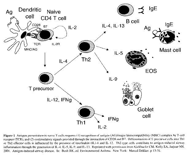 Allergens are tiny proteins that are capable of inducing an immune response in the body. Most of the time this response is appropriate, i.e. it helps the body rid itself of foreign substances. However, in some people, the response is too exuberant—this is called hypersensitivity. The following drawing depicts the cells and cytokines involved in the development of allergy{4165}. Some allergens from animals have