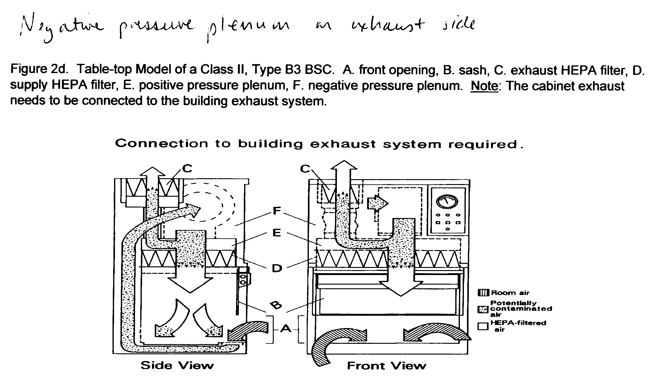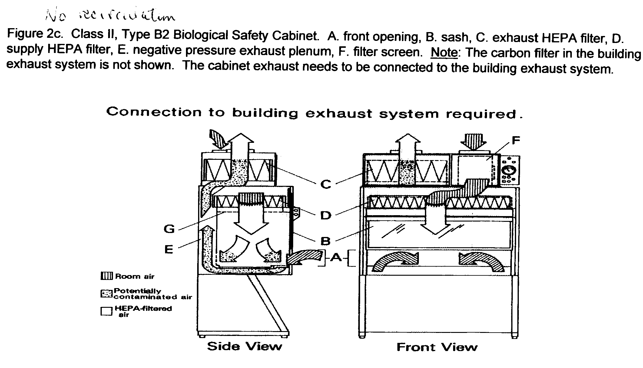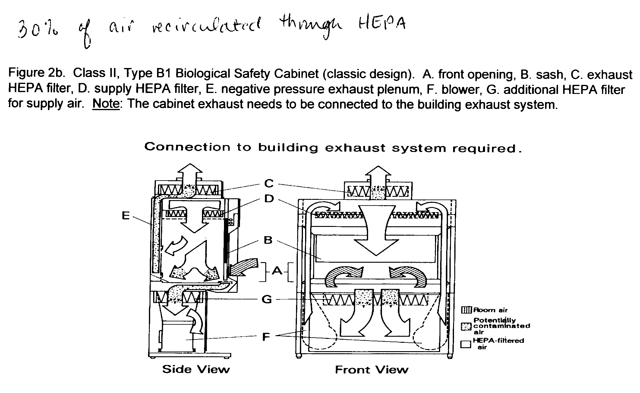 a HEPA filter, either into the lab or outside. Since room air flows into the