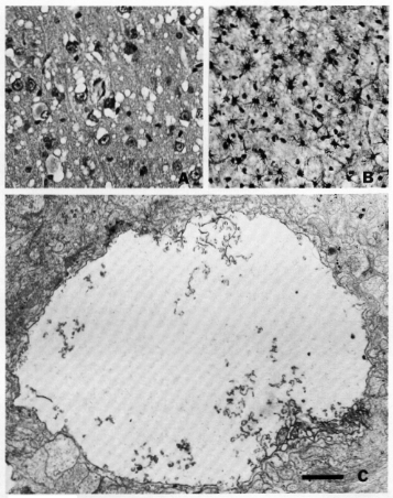 Ag 1A—Spongiform degeneration of cerebral cortex in experimental kuru. (H&E, x 400). B—Astrocytic hypertrophy in the cerebral cortex in Creutzfeldt-Jakob disease. (Cajal’s gold sublimate, x 200). C—Dilated nerve cell process containing curled membrane fragments in experimental kuru. (Line